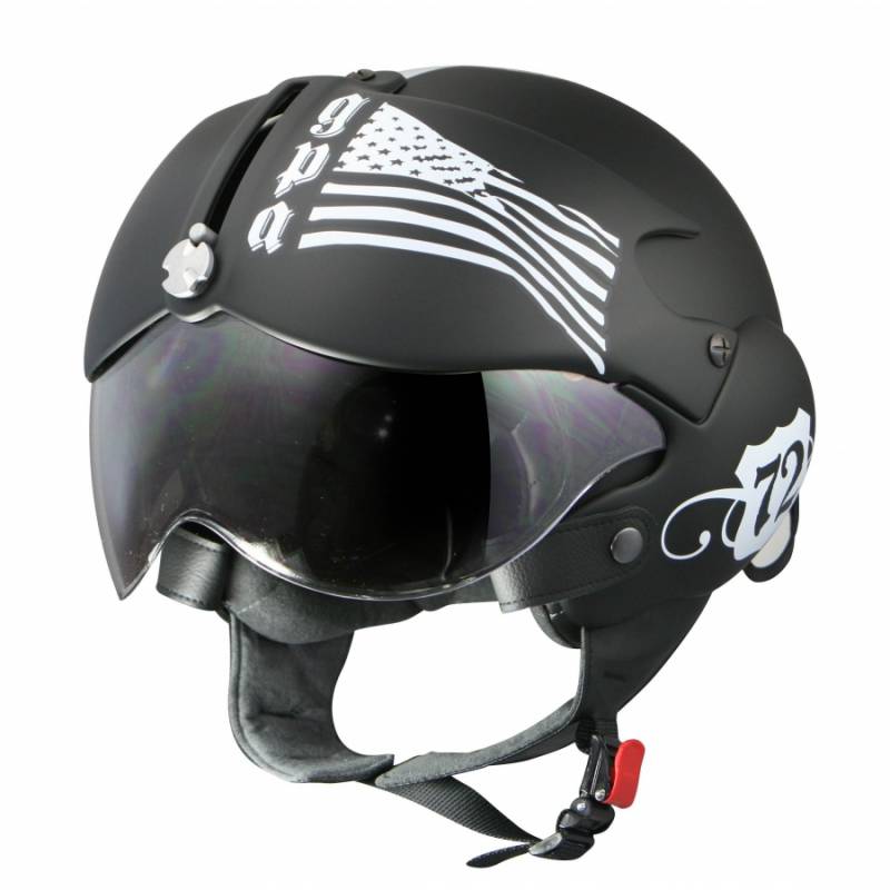 En noir uni ou paré de ses déco inspirées des USA et du Japon, le casque jet GPA "Aircraft" a un design singulier. Une esthétique qui n'est pas sans rappeler celle des casques des pilotes de chasse.
